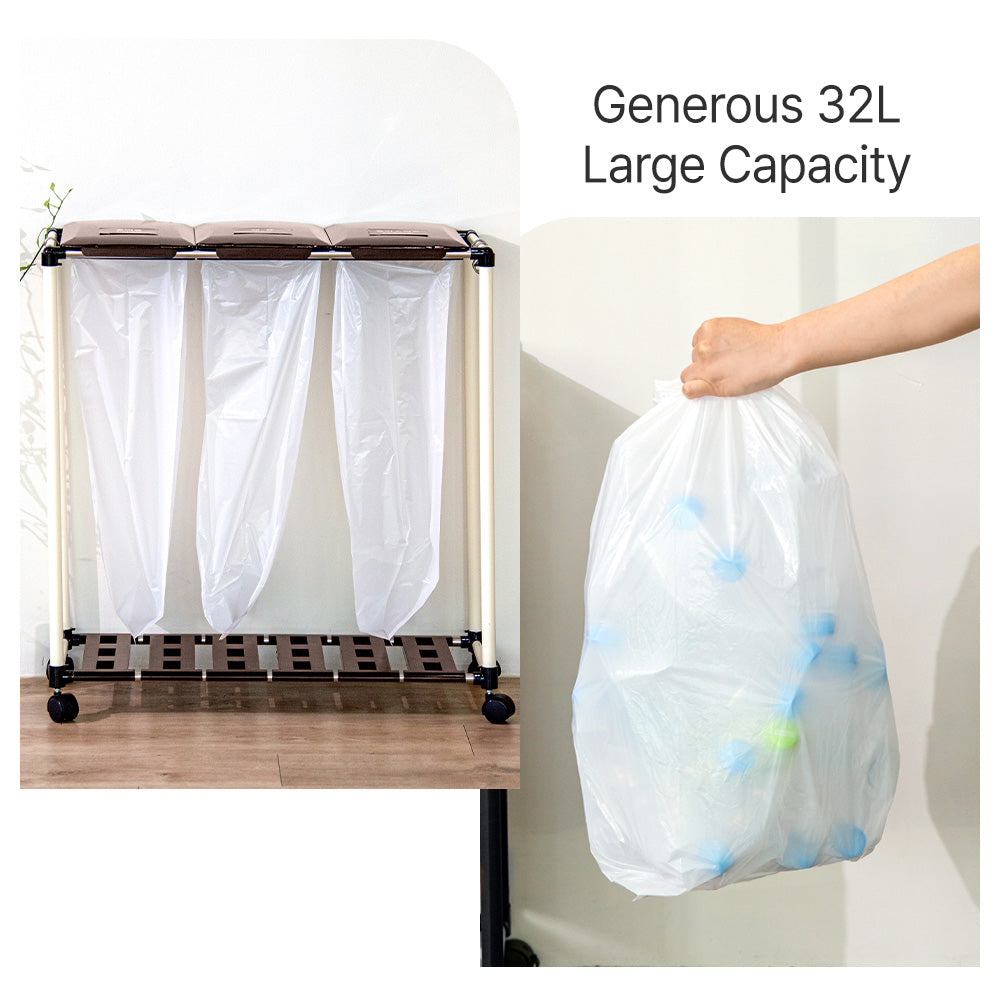 1, Triple Compartment Design (32L x 3 Bins): The bin features three 32-liter compartments, providing a total 96-liter capacity for effortless separation of recyclables, general waste, and compost.