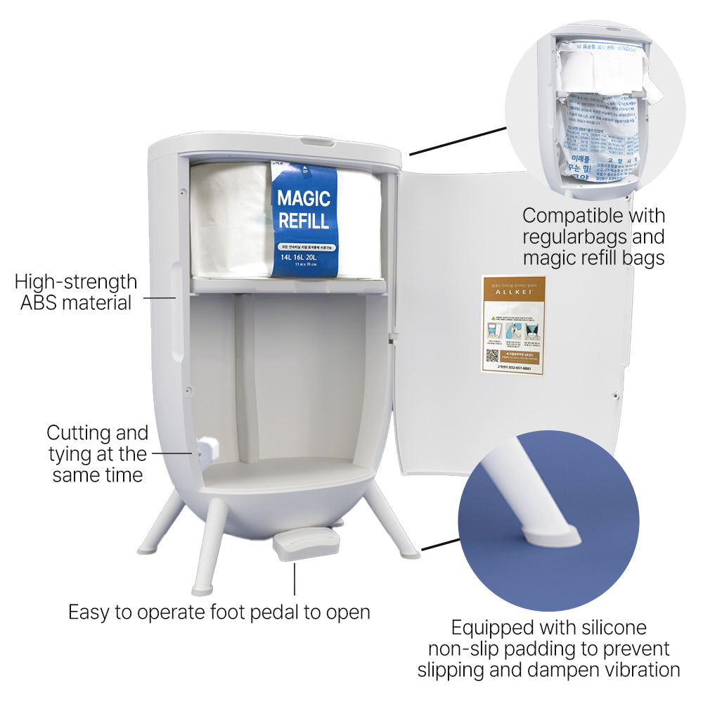 4, Continuous Refill Bag System: Includes a smart bag refill system with continuous liner technology, making it easy to replace bags without mess or hassle.